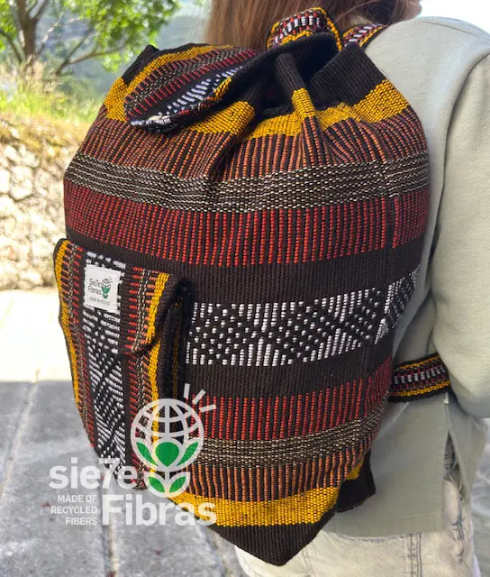 Práctica mochila de estilo morral mexicano, tejido con fibras 100% recicladas, estas coloridas y prácticas mochilas miden:
