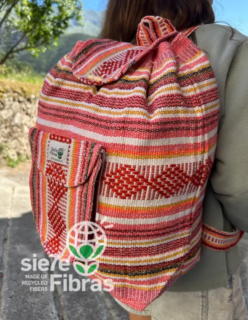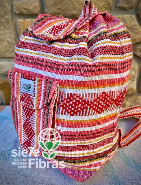 Práctica mochila de estilo morral mexicano, tejido con fibras 100% recicladas, estas coloridas y prácticas mochilas miden: